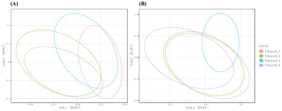 Fungal and bacterial sequence analyses were bioinformatically treated on a Galaxy server using the FROGS metabarcoding pipeline [36,37] from the portal of the Toulouse Midi-Pyrenees bioinformatics platform. Briefly, sequences were selected according to the following criteria: The bacterial 16S and fungal ITS gene paired-end reads (R1 and R2 reads) were merged with a maximum of 10% mismatches in the overlap region using VSEARCH version 2.22.1 software [38]. Then, reads with no expected length and the ones containing ambiguous bases were discarded. Next, the SWARM clusterization tool was used to cluster the sequences into operational taxonomic units (OTUs) with an aggregation distance of 3 [39]. Chimeric sequences were identified using the tool VSEARCH combined with original cross-sample validation and then removed. Once the chimeric sequences were removed, a final filter was applied to discard the OTUs represented in total by less than five reads [40]. The FROGS ITSx was used to extract the highly variable ITS1 subregion from the ITS sequences; meanwhile, this extraction step was not applied to the 16S sequences. Taxonomy was assigned to the OTUs at a 97% sequence similarity using the Basic Local Alignment Search tool (BLAST version 2.9.0) [41] against the SILVA database, version 123 (https://www.arb-silva.de/contact/ accessed on 14 April 2021) and the UNITE database, version 7.1 (https://unite.ut.ee/cite.php accessed on 14 April 2021) for 16S and ITS, respectively [42]. The OTUs with no kingdom-level classification or matching chloroplast, mitochondrial, or Viridiplantae sequences were then removed from the dataset. Finally, the rarefied OTU table was used as input for the subsequent analyses of the alpha and beta diversities.