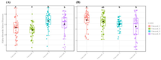 Boxplot illustrating the differences in Shannon diversity measures of the fungal (A) and bacterial (B) communities between vineyards. Different letters above bars indicate a significant difference at p-value ≤ 0.01 according to Tukey’s post hoc test after ANOVA.