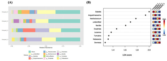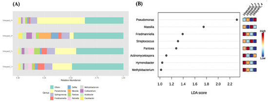 The linear discriminant analysis effect size (LEfSe) algorithm was performed to determine differential abundant taxa in the different vineyards [47]. The online MicrobiomeAnalyst version (2.0) software was used, the threshold for the logarithmic LDA score was set at 1.0, and the Wilcoxon p-value was set at 0.01 to identify taxa whose relative abundances were significantly different among vineyards.