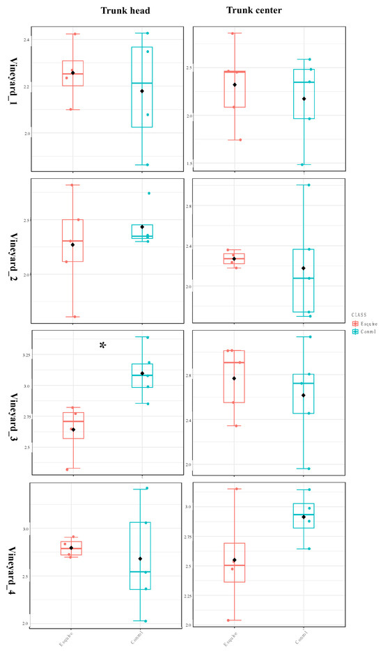 To achieve this objective, the effect of the Esquive® WP treatment on bacterial and fungal communities of grapevine inner healthy wood was evaluated in grapevine from three different French cultivars located in geographically distinct viticultural zones. The Chardonnay cultivar was selected in both Vineyard_1 and Vineyard_2, and Cabernet Sauvignon and Melon de Bourgogne were studied in Vineyard_3 and Vineyard_4, respectively. The first result of our study was that the Esquive® WP pruning wound treatment had no significant effect on inner wood necroses, which depend mainly on the grapevine’s age and cultivar. For the same cultivar (i.e., Chardonnay), the wood necroses observed in 24-year-old plants were significantly higher than those measured in 14-year-old plants. Plant age is obviously a critical factor for GTD development. In order to explain the grapevine age implication in GTDs, Mugnai et al. [60] detailed that the higher incidence of esca in old vineyards can be due to the fact that younger affected plants do not yet show the whole range of internal and external esca symptoms. Regarding plants of the same age but of different cultivars, the wood necrosis area measured in the Melon de Bourgogne cultivar (Vineyard_4) was significantly higher than those measured in Chardonnay (Vineyard_1 and Vineyard_2) and Cabernet Sauvignon (Vineyard_3) cultivars. In addition, significant differences in the wood necrosis length were observed in plants of the same age and different cultivars. This result is consistent with those obtained in previous studies, indicating that the length of inner wood necrosis caused by pathogens involved in GTDs is cultivar-dependent [61,62,63]. Recently, Etienne et al. [64] reported that the esca incidence is higher in the Melon de Bourgogne cultivar than in Cabernet Sauvignon and Chardonnay ones.