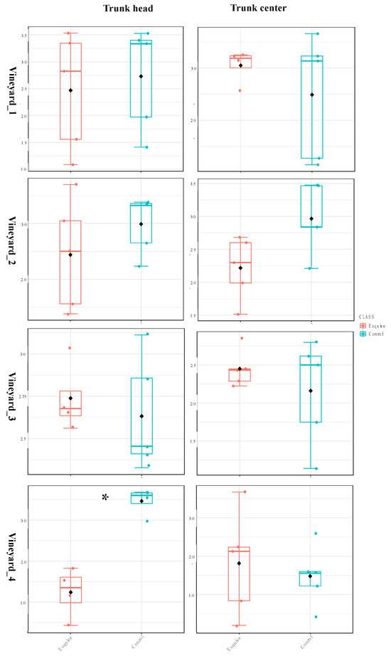 Boxplot illustrating the differences in Shannon diversity measures of the fungal communities in the grapevine healthy wood of Esquive® WP-treated and control plants at 2 months post-inoculation (T1). * Indicates significant differences between treatments (p < 0.01).