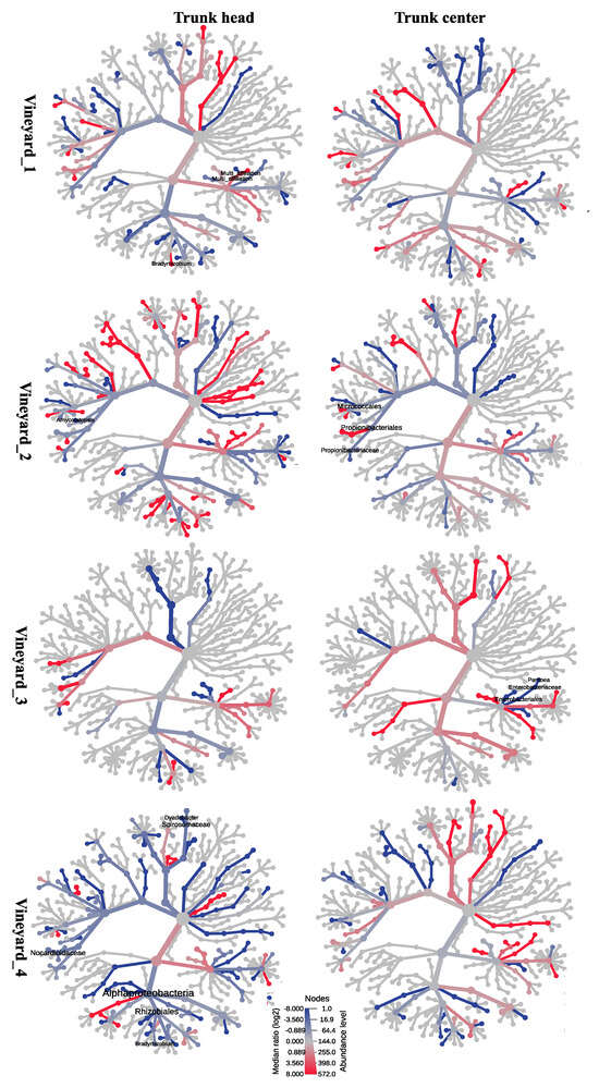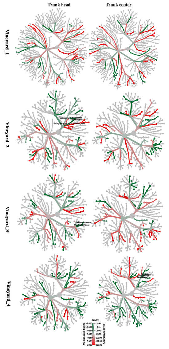 Heat trees of factor treatment. Heat trees report the effect of treatment on a hierarchical structure of taxonomic bacterial classifications in Esquive® WP-treated and control plants 2 months post-inoculation. Each cladogram shows pairwise comparisons between treatments (Esquive® WP vs. control) in the different vineyards on two different tissues (trunk head and trunk center). The indicated taxa with red nodes were significantly abundant in the Esquive® WP -treated plants, while green nodes were significantly more abundant in bacterial communities of control plants.