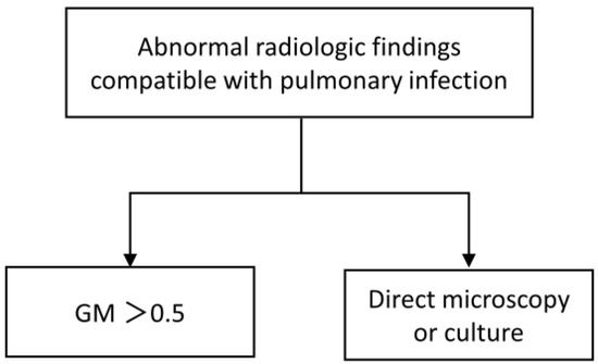 The diagnosis of IPA was classified as proven, probable, possible IPA, or Aspergillus colonization according to the definitions of the EORTC/MSG consensus [9]. Due to the severe coagulopathy and the concern of bleeding complications, none of the ACLF patients underwent bronchoscopy for needle aspiration biopsy, and only two patients underwent bronchoalveolar lavage. Considering ACLF as a host risk factor for IPA, patients with possible IPA were defined as having probable IPA if they met both of the following criteria: (1) the presence of abnormal radiologic findings compatible with pulmonary infection, including classical signs of IPA (dense, well-circumscribed lesions with or without a halo sign, air crescent sign, or cavity) or non-classical findings such as masses and (2) the presence of Aspergillus species indicated by direct test (direct microscopy or culture) or galactomannan (GM) antigen detected in plasma with a cut-off point value of 0.5 (Figure 1).