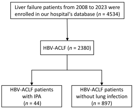This retrospective study included patients with probable IPA diagnosis admitted with ACLF to the West China Hospital of Sichuan University from February 2008 to September 2023. The data of patients without pulmonary infection were collected from the same databases. Clinical data from all selected patients were reviewed, including demographic features, predisposing factors, clinical manifestations, results of laboratory tests, chest computed tomography (CT) images, treatments, and prognosis. Informed consent was not obtained since it was a retrospective analysis of the collected data, and the participants’ identities were kept confidential. The study protocol was approved by the Ethics Committee of the West China Hospital of Sichuan University (Chengdu, Sichuan, China) following the ethical guidelines of the 1975 Declaration of Helsinki (approval number: 2023-1884). Subjects with other clinical liver diseases, such as autoimmune liver diseases, alcoholic liver disease, drug-induced liver injury, hepatocellular carcinoma, hematologic malignancy, bile duct obstruction, Wilson’s disease, chronic hepatitis C infection, or human immunodeficiency virus coinfection, were excluded.