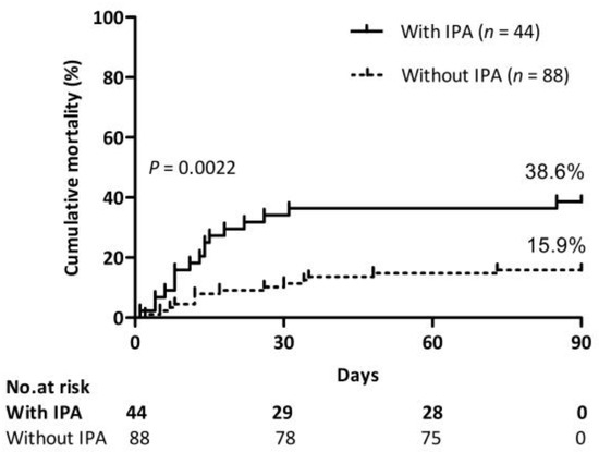 Impact of IPA on mortality. Cumulative 90-day mortality of patients with or without IPA. Log-rank test (38.6% vs. 15.9%, p = 0.0022).