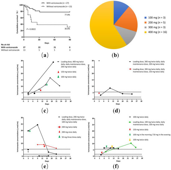 Plasma voriconazole concentration measurements were performed as therapeutic drug monitoring in 55.6% (15/27) of the patients. Our hospital’s normal range of plasma voriconazole concentration levels were 1.5 μg/mL to 5.5 μg/mL. Nine patients underwent plasma voriconazole concentration monitoring more than twice; the maintenance dose was based on the plasma voriconazole concentration. The drug concentrations exceeded the safe range in 60% (9/15) of the patients (Figure 4c–f). Out of four patients treated with a standard dose regimen (loading dose, 400 mg twice daily; daily maintenance dose, 200 mg twice daily), in two cases the plasma concentrations exceeded the safe range (Figure 4c). The remaining 11 patients were treated with a reduced dosage regimen. Out of three patients treated with a reduced dose regimen (loading dose, 300 mg twice daily; daily maintenance dose, 150/200 mg twice daily), in two cases the plasma concentrations exceeded the safe range (Figure 4d). Out of four patients treated with a reduced dose regimen (loading dose, 200 mg twice daily; daily maintenance dose, 100 mg twice daily) and one with a reduced dose regimen (200 mg twice daily), in two cases the plasma concentrations exceeded the safe range and in one case the plasma concentration was less than 1.5 μg/mL (Figure 4e). Out of one patient treated with a reduced dose regimen (loading dose, 100 mg twice daily; daily maintenance dose, 100 mg once daily) and two with a reduced dose regimen (100 mg twice daily), all three cases had plasma concentrations that exceeded the safe range (Figure 4f).