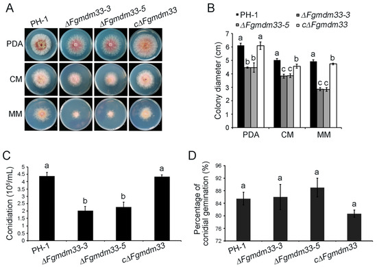 ΔFgmdm33 mutants are defective in mycelial growth and conidiation. (A), Colony morphology of the wild-type strain PH-1, the ΔFgmdm33 mutants, and the complemented strain cΔFgmdm33 grown on PDA, CM, and MM plates at 25 °C for 3 days. (B), The colony growth of each strain in A. Error bars represent the standard deviation. Different small letters indicate a significant difference (p < 0.05). (C), A bar chart depicting the statistical analysis of conidiation. Conidia produced by each strain were quantified with a hemacytometer after incubation in the CMC liquid medium for 4 days in the light. Different small letters indicate a significant difference (p < 0.05). (D), The percentage of conidial germination. The conidia of each strain were cultured in a 2% sucrose solution and examined under a light microscope after 24 h. The same small letters indicate no significant difference (p < 0.05).