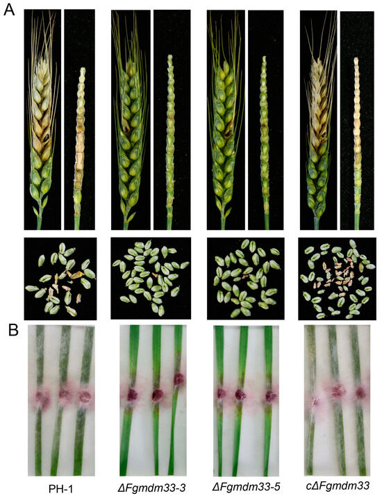 F. granminearum wild-type strain PH-1 [33] served as a progenitor for generating the deletion mutants of FgMDM33. PH-1, the ΔFgmdm33-3 and ΔFgmdm33-5 mutants, and the complemented strain cΔFgmdm33 were cultured on potato dextrose agar (PDA) plates at 25 °C with 12 h light/12 h dark cycles.