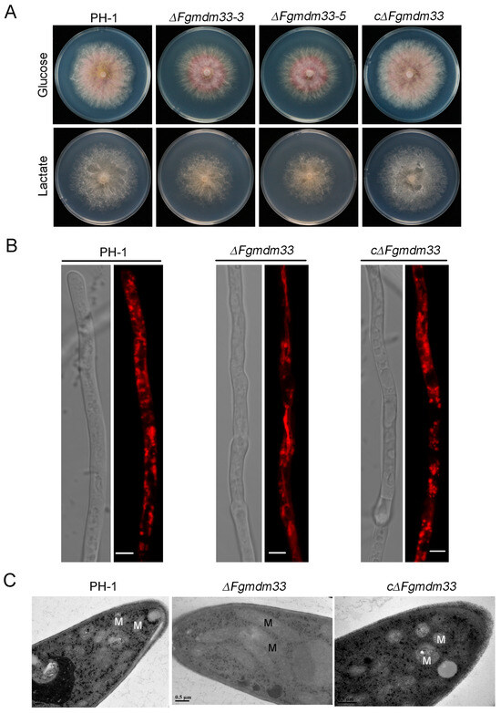 FgMDM33 may be involved in mitochondrial fission. (A), Colony growth of the wild-type strain PH-1, the ΔFgmdm33 mutants, and the complemented strain cΔFgmdm33 on CM plates containing glucose or lactate. (B), The mitochondria in the hyphal cells of the ΔFgmdm33 mutant were elongated. Each strain was grown in a CM liquid medium for 24 h at 25 °C, after which the hyphae were harvested and stained with MitoTrackerTM Red for microscopic observation. Scale bar = 5 μm. (C), Ultrastructural morphology of the mitochondria in the hyphal cells of each strain was visualized by transmission electron microscopy. M, mitochondria. Scale bar = 0.5 μm.