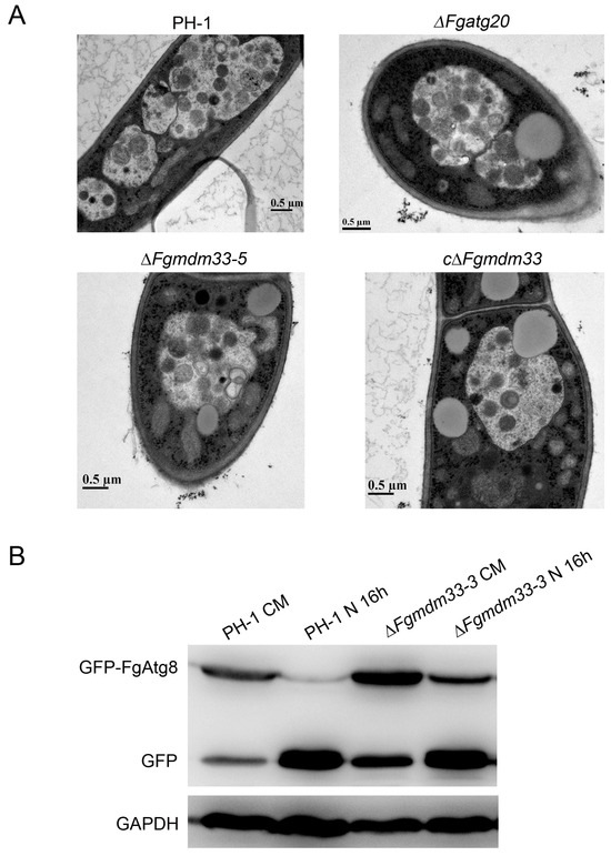 The deletion of FgMDM33 caused defects in non-selective macroautophagy. (A) FgMDM33 is dispensable for mitophagy in F. graminearum. The observation of autophagic bodies in the vacuoles of wild-type strain PH-1, the ΔFgmdm33 mutants, and the complemented strain cΔFgmdm33. Each strain was cultured in liquid CM at 25 °C for 24 h, after which it was shifted to BM-G for 30 h and starved in MM-N for another 24 h. Scale bar = 0.5 μm. (B) GFP-FgAtg8 proteolysis assays. Immunoblot assays with the total lysates from CM- or MM-N-cultured strains with an anti-GFP antibody or anti-GAPDH antibody.