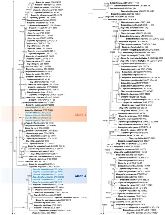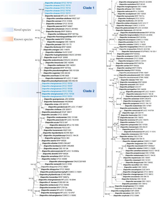 Phylogenetic tree of Diaporthe based on multiple gene loci (ITS, cal, his3, tef1-α and tub2) derived from ML analysis. ML bootstrap support values above 60% and Bayesian posterior probabilities above 0.95 are shown near nodes. Ex-type isolates are in bold. Strains in the current study are in blue. Isolates in this study are highlighted in two different colours. Clade 1–2, 4, 6 represent novel species. Clade 3, 5 represent known species.