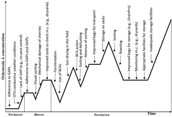 Figure 1. Time course of ochratoxin A formation in relation to proposed mitigation strategies in coffee during pre-harvest, drying, and post-harvest (adapted from Pitt et al., 2013) [9]. M.c.: moisture content; GAP: good agricultural practices; BCA: biocontrol agent.