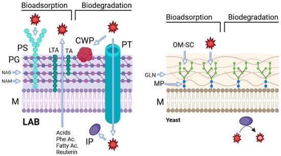 Figure 2. OTA adsorption and degradation mechanisms of LAB and yeasts found in coffee. Created in Biorender.com. M = membrane; PG = peptidoglycan; PS = polysaccharides; NAG = N-acetyl glucosamine; NAM = N-acetyl muramic acid; LTA = lipoteichoic acids; TA = teichoic acids; CWP = cell wall protein; PT = peptide transporter; IP = intracellular peptidase; MP = mannoproteins; GLN = glucan; OM-SC = mannan oligosaccharides.