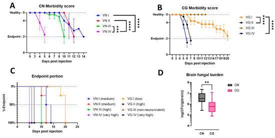 Neurovirulence evaluation of BALB/cAnNCrl mice infected by stereotactic injection with cryptococcal isolates of the different major molecular types. (A,B): The graphs show a longitudinal assessment of neurotypical symptoms in mice stereotactically infected with various CN (VN I–IV) or CG (VG I–IV) molecular types. Each graph shows the morbidity scoring per mouse group with standard deviation (p-values: *** < 0.001, **** < 0.0001). (C): The isolates were classified on the day of the average time needed for the morbidity score to reach a level of 2. “very high” (≤6 days), “high” (>6 days to ≤10 days), “medium” (>10 days to ≤15 days), “low” (≥16 days), or “non-neurovirulent” due to full recovery. (D): normalized brain fungal burden (Colony forming units divided by brain weight) shows a higher fungal burden in the CN species compared to the CG, Unpaired Welch’s t test (p-value = 0.0059 **).