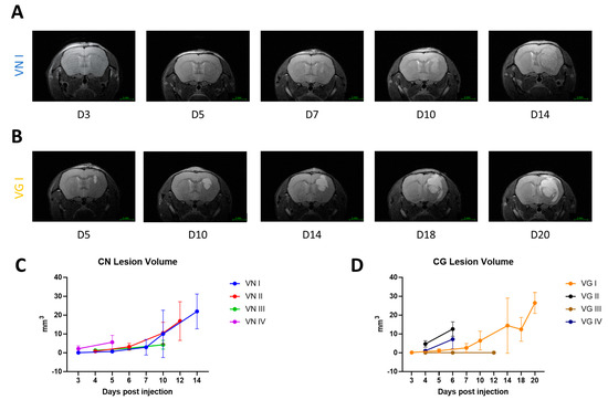 Longitudinal T2–weighted MR images of two representative CN/CG isolates and assessment of cryptococcomas lesion volume induced by isolates of the different major molecular types. (A). Longitudinal T2–weighted MR images in the axial orientation of a representative animal infected with the VN I isolate. (B). Longitudinal T2–weighted MR images in the axial orientation of a representative animal infected with the VG I isolate. The graphs in (C,D) show the longitudinal evaluation of the lesion volume induced by the different CN (VN I–IV) or CG (VG I–IV) molecular types. Each time point shows the average lesion volume with standard deviation (n = 4).