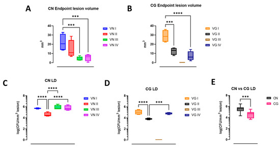 Cryptococcal lesion volume and density at endpoint induced by different molecular types. (A,B) boxplots show endpoint median lesion volume distribution, standard deviation and statistical differences of CN and CG isolates, respectively (p-values: *** < 0.001). The graphs (C,D) show lesion density (LD), calculated by the logarithm of CFU/lesion volume. One-way ANOVA with Fisher LSD test. (E) Comparison of lesion density (LD) by grouping all CN and all CG isolates. Unpaired Welch’s t test. (p-values: *** < 0.001, **** < 0.0001). VG III is shown for reference in graphs (B,D); however, since it is a non-neurovirulent isolate, it was not included in (E) or any statistical analysis.
