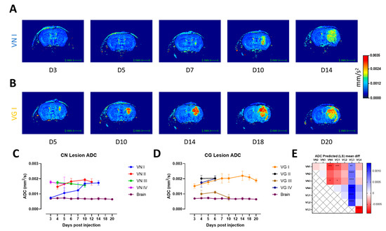 Evaluation of ADC values in the lesion material and contralateral hemisphere in a single lesion brain model of cryptococcosis. (A,B) Longitudinal ADC maps of lesions representing one CN and one CG (B) relevant molecular type. (C,D) Longitudinal assessment of ADC values in the lesion and in the contralateral brain for reference for isolates of CN and CG species complexes. (E) Correlation matrix of ADC values shows predicted mean difference between all isolates and relative statistical difference expressed in p–value in stars. Statistical analysis was performed with mixed effect analysis 2–way ANOVA with Tukey’s multiple comparison. (p–values: * < 0.05, ** < 0.01, *** < 0.001, **** < 0.0001).