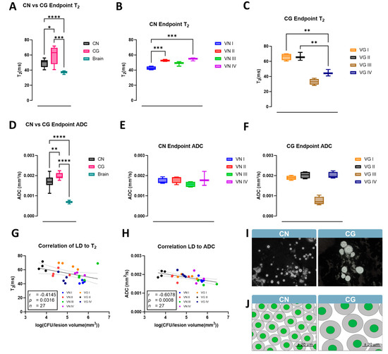 qMRI analysis (T2 and ADC values) of the lesions at endpoint induced by isolates of different molecular types and correlation with lesion density (LD). (A). Comparison between average CN, CG, and contralateral brain T2 values. (B,C). T2 values of CN and CG at endpoint show statistical differences between isolates. (D). Comparison between ADC values of CN, CG, and contralateral side. Statistical differences were calculated with one–way ANOVA with Welch’s multiple comparison test (p–values: * < 0.05, ** < 0.01, *** < 0.001, **** < 0.0001). VG III is shown for reference but is not included in the statistical analysis. (E,F). ADC values of CN and CG at endpoint with statistical differences between isolates. (G,H). Graphs show Pearson linear correlation (r) of T2 and ADC values to fungal lesion density (LD). (I). India ink stainings confirm a reduction in cell density within CG compared to CN, supporting the association between the increased capsule size and T2/ADC values. (J). Lesion cell structure model that links decreased cell density in CG compared to CN with increased capsule size and T2/ADC values as proposed by Vanherp et al. [38].