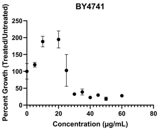 Previously, we demonstrated the antifungal activity of DEA against several yeast and filamentous fungi [22]. The S. cerevisiae parental strain BY4741 was used to elucidate the mechanism of action of antifungal compounds. To better characterize the antifungal activity of DEA against S. cerevisiae, growth was measured in liquid cultures in the presence of varying concentrations of DEA (5–60 μg/mL). Relative to the control media, growth was increased by ~100% at 20 μg/mL DEA and inhibited by 20% at a slightly higher concentration (25.5 μg/mL DEA) (Figure 1). These results suggest the antifungal response of S. cerevisiae to DEA may be occurring in a pattern of hormesis, in which the concentration of the toxic threshold of DEA resulted in greater growth/adaptive response in the yeast.