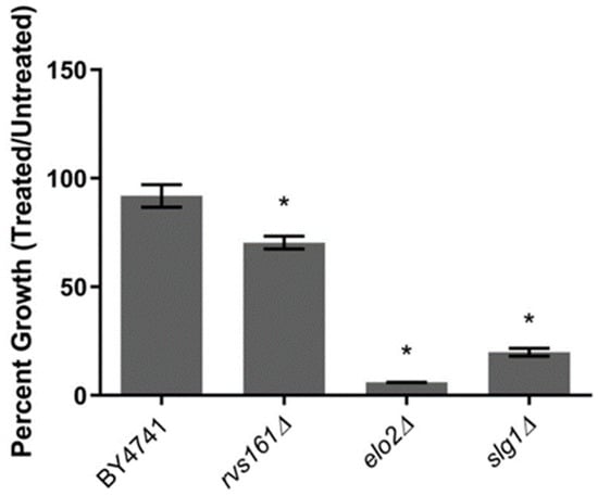 Agar-based chemical-genetic analyses using an S. cerevisiae deletion collection have been used to determine the mechanism of action of hundreds of compounds [33]. To identify genes and their associated processes that buffer the mechanism of DEA, growth was quantified for ~4600 gene deletion strains on synthetic complete (SC) agar in the presence and absence of 50 μg/mL of DEA. This concentration inhibited the growth of BY4741 (wild type) yeast on agar by 20% compared to the untreated media, thus leaving open a large window (80%) to detect additional growth defects due to gene deletions. In high-throughput format (i.e., 384-colony format in quadruplicate), a significant growth defect was observed for 137 deletion strains (~3% of tested strains). To confirm that these knockout strains were truly sensitive, growth was measured in low-throughput format in liquid. Each strain was cultured in SC broth containing DEA at 25.5 μg/mL, an IC20 concentration in the parental BY4741 strain. Out of the 137 deletion strains, only 3 (rvs161∆, elo2∆, and slg1∆) exhibited statistically significant growth reductions (p < 0.05) in DEA compared to the control media (Figure 2). The most sensitive was elo2∆ (<10% growth), followed by slg1∆ (20% growth) and rvs161∆ (72% growth). RVS161 encodes a lipid raft protein in the cell wall that regulates the polarization of the actin cytoskeleton and endocytosis [34]. ELO2 encodes a fatty acid elongase integral to the elongation of fatty acids up to 24 carbons in length, a process that is upstream of sphingolipid biosynthesis and inherently also impacts cell wall integrity [35,36]. SLG1 encodes a sensor–transducer in the plasma membrane integral to the transduction of stresses detected at the cell wall, the organization of the actin cytoskeleton, mitophagy, pexophagy, and cell wall organization [37,38].