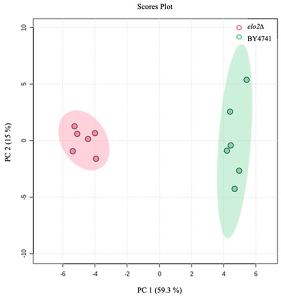 To evaluate these metabolite profiles at T0, a principal component analysis (PCA) was conducted to reduce the complexity of these data. With the PC1 and PC2 axes explaining ~75% of the variance, the metabolite profiles were clearly distinct for BY4741 and elo2∆ (Figure 3). Notably, the clustering was independent of the DEA treatment, which was expected at T0. Therefore, the metabolite profiles confirm there were no significant differences within the replicates of strains or conditions at this time point, and moreover, these data reflect fundamental metabolic differences between the BY4741 and elo2∆ strains.