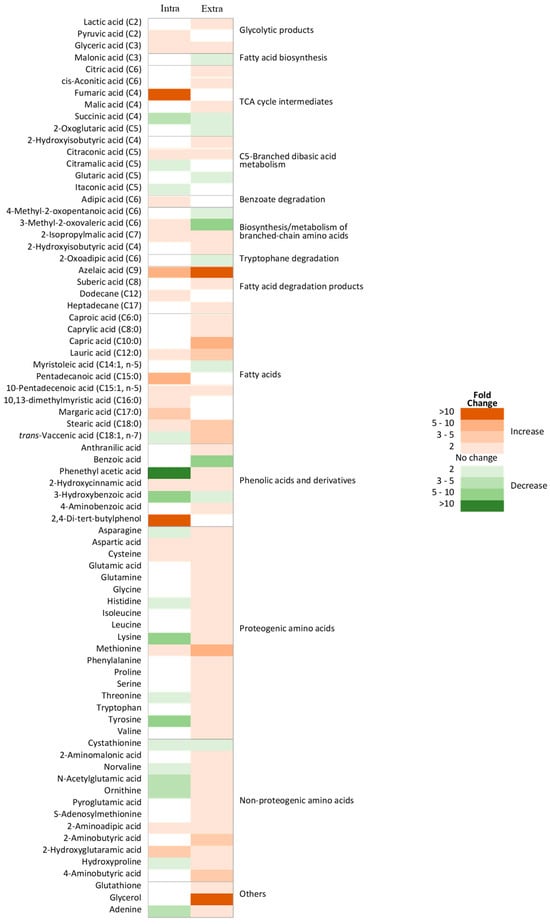 Heat map showing differences in intra- and extracellular metabolome of Saccharomyces cerevisiae elo2∆ and its parental strain (BY4741) immediately after the addition of disalt of epipyrone A (T0). Intra, intracellular; Extra, extracellular.