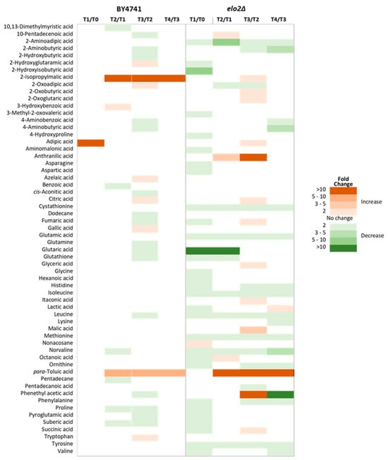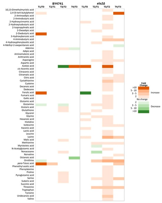 In contrast, the DEA-treated elo2∆ did not show an initial decrease in the level of adipic acid or a significant/prolonged increase in the intracellular levels of 2-isopropylmalic acid (Figure 5). However, the level of p-toluic acid, a known toxic compound [43], showed a continuous increase intracellularly over time and even more pronounced than in the parental strain. Considering that the parental strain also showed a parallel significant increase in p-toluic extracellularly in T1 and T2, suggesting an active secretion of this toxic phenolic acid, this indicates that elo2∆ mutation may have affected the ability of the yeast cell to efficiently keep the excess of p-toluic acid outside the cell. Therefore, increased levels of p-toluic acid could be a downstream cellular effect of DEA. Distinct to elo2∆, the levels of anthranilic and phenylethyl acetic acid were also increased intracellularly; anthranilic acid was increased at T2 until T3, while phenyl ethyl acetic acid was increased at T3. With the apparent diminished ability to keep the excess of p-toluic acid outside the cell, this compound is likely to have induced further biochemical transformations inside elo2∆ cells, explaining the increased levels of other aromatic compounds, probably derived from p-toluic acid. Contrary to the parental strain, elo2∆ also showed a significant decrease in the level of several intracellular metabolites in the first hour in the presence of DEA, such as several proteogenic amino acids, 2-hydroxyisobutyric, and glutaric acids, which could suggest an increased secretion of these metabolites. The most pronounced decrease was glutaric acid with a 10-fold reduction compared to T0. Additionally, decreased levels of several intracellular metabolites were perdured for the whole or majority of the incubation period, such as 2-aminoadipic acid, cystathionine, and many proteogenic amino acids.