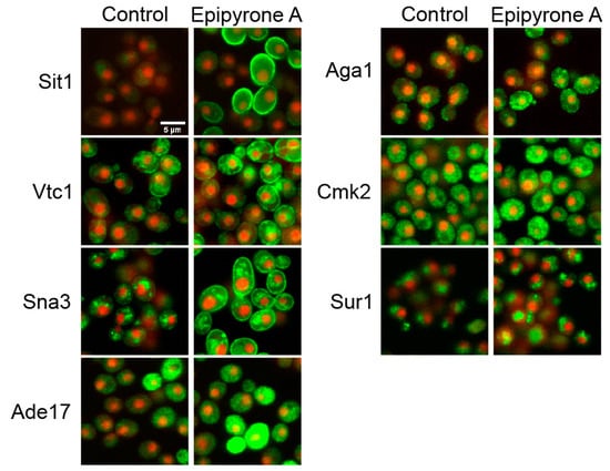 Disalt of epipyrone A (DEA) alters the abundance or localization of seven GFP-tagged proteins. Cells were grown for 8 h in absence or presence of 25.5 µg/mL DEA (IC20) in synthetic complete broth, then imaged using an Incell analyser 6500HS (General Electric). For reference, nuclei were distinguished with RFP. These proteins include Sit1(YEL065W); Vtc1 (YER072W); Sna3 (YJL151C); Ade17 (YMR120C); Aga1 (YNR044W); Cmk2 (YOL016C); and Sur1 (YPL057C).