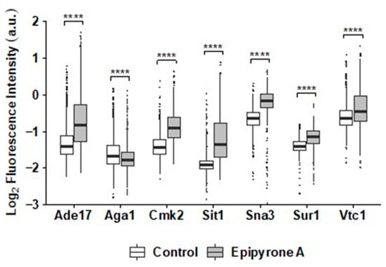 Quantitative comparison of GFP-tagged protein intensity in presence and absence (control) of disalt of epipyrone A (DEA). Cells were grown for 8 h in absence or presence of 25.5 µg/mL DEA (IC20) in synthetic complete broth, then imaged using an Incell analyser 6500HS (General Electric). These proteins include Ade17 (YMR120C); Aga1 (YNR044W); Cmk2 (YOL016C); Sit1(YEL065W); Sna3 (YJL151C); Sur1 (YPL057C); and Vtc1 (YER072W). **** represents p < 0.0001.