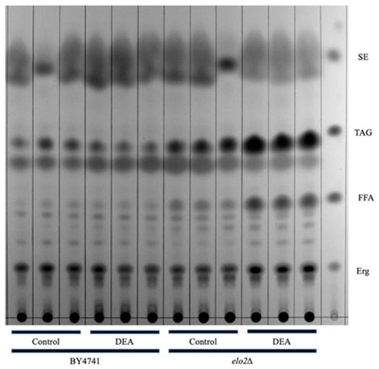 Neutral lipids were visualized using thin-layer chromatography (TLC), as previously described [31]. Strains were grown overnight in SC medium at 30 °C with constant rotation. The cells were then diluted to a concentration of 2.55 × 106 cells/mL in 7 mL of SC media and grown for 8 h in the presence or absence of DEA (25.5 μg/mL). Lipids were extracted using a Folch extraction [32] and separated using hexane/petroleum, ether/diethyl, and ether/acetic acid (50:20:5:1, v/v/v/v) as the solvent. The neutral lipids were stained with iodine and imaged using a digital camera.