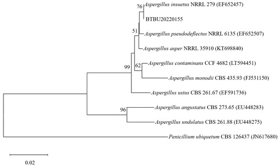 - Houbraken, J.; Due, M.; Varga, J.; Meijer, M.; Frisvad, J.C.; Samson, R.A. Polyphasic taxonomy of Aspergillus section Usti. Stud. Mycol. 2007, 59, 107–128. [Google Scholar] [CrossRef] [PubMed]