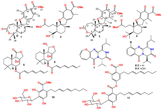 - Cueto, M.; MacMillan, J.B.; Jensen, P.R.; Fenical, W. Tropolactones A-D, four meroterpenoids from a marine-derived fungus of the genus Aspergillus. Phytochemistry 2006, 67, 1826–1831. [Google Scholar] [CrossRef] [PubMed]
