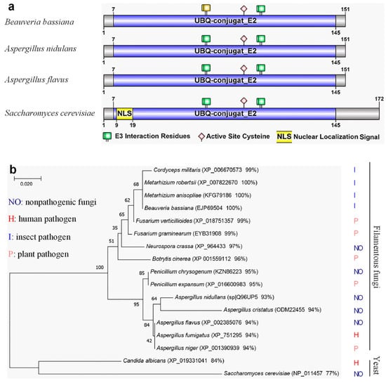 Structural analysis of B. bassiana Rad6 and its phylogenetic relationship with other fungal homologues. (a) Domain analysis of B. bassiana Rad6. (b) The phylogenetic relationship between B. basiana Rad6 and other fungal homologues. Bootstrap values obtained through 1000 replications are presented at the nodes for reference. The branch length in the scale is proportional to the genetic distance, as determined using the neighbor-joining method within the MEGA7 program, accessible at http://www.megasoftware.net/ (accessed on 8 October 2019) (note: the accession number of each protein in NCBI and its similarity to the corresponding protein of Beauveria bassiana Rad6 are shown in parentheses).