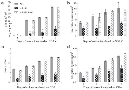 The Δrad6 strains exhibited significant defects in both conidial production and hyphal growth, irrespective of whether they were cultured in nutrient-rich or nutrient-poor media. When cultured on SDAY plates, the conidial production of Δrad6 was significantly dropped by approximately 94% after a 7-day culture (Figure 2a). The dry hyphal mass of the Δrad6 was also significantly lower than that of the control strains (Figure 2b). Similarly, on nutrient-poor CDA plates, the Δrad6 strains produced only 33.65% of the conidia that the WT strains did after four days of incubation and reached 33.78% after seven days (Figure 2c). The dry hyphal biomass of Rad6 disruption mutant ranged from 40.93% to 54.22% of that in WT strains (Figure 2d). Generally, the phenotypic defects caused by disruption of rad6 could be rescued by its complementation. The dry hyphal biomass and the conidial production of Δrad6::rad6 cultured on SDAY or CDA were restored to a level close to that of WT.