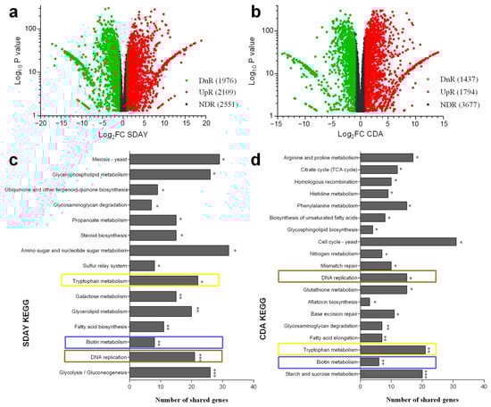 Transcriptome analysis of Δrad6 vs. WT collected from different culture media. (a,b) Distribution of log2 FC and p values for genes identified in the transcriptomes from SDAY and CDA cultures. (c,d) KEGG pathway enrichment analysis of DEGs from SDAY and CDA cultures. Differentially expressed genes (DEGs) are defined as log2 FC ≤ –1 or log2 FC ≥ 1 at the level of p < 0.05. The remaining genes are insignificantly affected (–1 ≤ log2 FC ≤ 1). (Note: DnR refers to downregulated, UpR refers to upregulated, NDR refers to non-significant differentially regulated. The pathways are ordered based on the significant results in the KEGG enrichment analysis. p-value < 0.001 labeled ***, p-value < 0.01 labeled **, and p-value < 0.05 labeled *).
