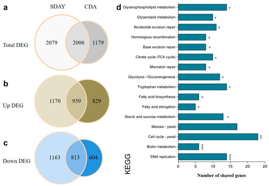 Analysis of genes co-occurring in the transcriptome of different media in B. bassiana. (a–c) Overlapped in the total, upregulated, and downregulated DEGs from SDAY and CDA cultures in B. bassiana. (d) KEGG pathway enrichment analysis of common DEGs from SDAY and CDA cultures. The pathways are ordered based on the significant results in the KEGG enrichment analysis. p-value < 0.001 labeled ***, p-value < 0.01 labeled **, and p-value < 0.05 labeled *.