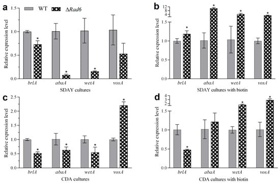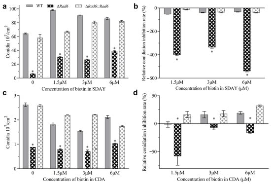 To investigate the potential biotin metabolism disorder, conidia from Δrad6 strains and the control strains were inoculated onto SDAY and CDA plates containing various biotin concentrations and incubated for eight days under optimal conditions. On the SDAY plates, the conidial production of Δrad6 was 6.13 × 107 conidia per cm2, only 9.52% of that of WT. However, it showed a significant increase (p-value < 0.05) to 39.24 × 107 conidia per cm2 after the addition of 6 µM biotin (Figure 5a). The relative conidiation inhibition (RCI) rates due to the addition of biotin were significantly lower in Δrad6 than that in WT (Figure 5b). On CDA plates, the conidial production of Δrad6 was 0.89 × 107 conidia per cm2, 33.78% of that of the WT strains. However, it showed a significant increase (p-value < 0.05) to 1.03 × 107 conidia per cm2 after the addition of 6 µM biotin (Figure 5c). The relative conidiation inhibition (RCI) rates due to the addition of biotin were also significantly lower in Δrad6 strains than that in WT (Figure 5d).