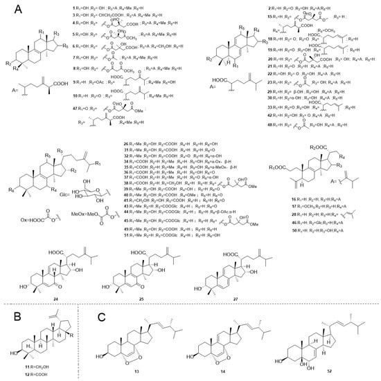 The chemical structures of triterpenoids in F. betulina. (A) Lanostane-type triterpenoids. (B) Lupane-type triterpenoids. (C) Ergostane-type triterpenoids.