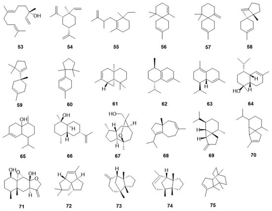 Sesquiterpene are polymers consisting of three isoprene units and exhibit a diverse range of complex skeletal structures [23]. These compounds are notably prevalent in fungi, with over 121 distinct sesquiterpene carbon skeletons identified to date [24]. Twenty-three sesquiterpenes were detected in the fruiting bodies and fermentation broth of F. betulina (Figure 2). In 2000, Rösecke, J. et al. [25] detected twenty sesquiterpene compounds from the fresh fruiting bodies of F. betulina, including (R)-trans-nerolidol (53), β-Elemene (54), Selina-4,11-diene (55), α-Chamigrene (56), β-Chamigrene (57), β-Bazzanene (58), Isobazzanene (59), α-Cuprenene (60), Thujopsene (61), Cadina-1(6),4-diene (62), δ-Cadinene (63), T-cadinol (64), 1-epi-cubenol (65), (S)-(−)-Daucene (68), β-Cubebene (69), α-Cubebene (70), Pentalenene (72), (−)-β-Barbatene (73), (+)-α-Barbatene (74), and Cyclobazzanene (75), among which 59, 68, 73, and 74 were reported as fungal components for the first time. In 2015, Sun, C. [26] identified three sesquiterpenes in a rich fermentation broth of F. betulina, including one tricyclic sesquiterpene, cryptosphaerolide B (71), and two bicyclic sesquiterpenes, rel-(1S,4S,5R,7R,10R)-10-desmethyl-11-euduemene (66) and 10,11-epoxyguaian-13-ol (67).