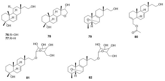 From a rich fermentation broth of F. betulina, a total of seven diterpenes have been identified (Figure 3). In 2015, Sun, C. [26] cultured the mycelium of F. betulina through liquid fermentation and isolated seven pimarane-type diterpenes from the fermentation broth, specifically identified as pipulinus A–D (76–79), pipulinus F (80), elaeicolasides B (81), and pipulinus E (82). Compounds 81 and 82 both contain sugar moieties. This study represents the first use of liquid fermentation for the isolation of compounds from F. betulina. It not only enriched the methods for extracting natural products from the fungus, but also significantly enhanced the efficiency of compound extraction.