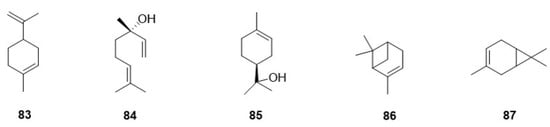 The chemical investigation of F. betulina fruiting bodies has revealed the presence of five distinct monoterpene compounds (Figure 4). In 1995, Rapior, S. et al. [27] detected one monoterpene compound, Limonene (83), in the fresh fruiting bodies of F. betulina, marking the first known monoterpene from this fungus. Subsequent research by Rösecke, J. et al. [25] in 2000 expanded this list significantly, uncovering four additional monoterpenes: Linalool (84), α-Terpineol (85), α-Pinene (86), and Δ-3-Carene (87). These findings deepen the understanding of the volatile constituents of F. betulina.