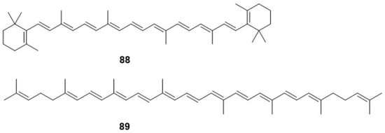 In a notable study conducted in 2011, Reis, F.S. et al. [28] analyzed the dried powder of F. betulina fruiting bodies and successfully identified two significant tetraterpene compounds (Figure 5). These compounds, β-carotene (88) and Lycopene (89), known for their potent antioxidant properties, were detected for the first time in this fungal species. This discovery not only enriches our understanding of the phytochemical composition of F. betulina, but also suggests potential nutritional and therapeutic applications of these fruiting bodies due to their tetraterpene content.