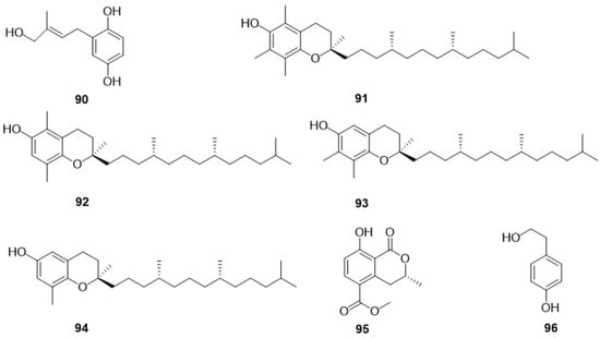 Research into the phenolic content of F. betulina has led to several significant discoveries over the years (Figure 6). In 2002, Kawagishi, H. et al. [29] isolated a novel phenolic compound (E)-2-(4-hydroxy-3-methyl-2-butenyl)-hydroquinone (90) from the fresh fruiting bodies of F. betulina. Further investigations by Reis, F.S. et al. [28] in 2011 expanded the known spectrum of phenolics in this species by detecting four tocopherols, α-tocopherol (91), β-tocopherol (92), γ-tocopherol (93), and δ-tocopherol (94), in a dried powder of F. betulina. In 2015, Sun, C [26] identified two phenolic compounds, (3R)-5-carbomethoxymellein (95) and 4-hydroxyphenethyl alcohol (96), in a rich fermentation broth of the fungus. These studies have further elucidated the chemical composition of F. betulina and enhanced our understanding of this type of fungus.