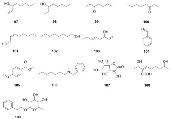 Over the last few decades, research into the small-molecule compounds present in F. betulina has yielded numerous significant discoveries (Figure 7). In 1995, Rapior, S. et al. [27] identified three volatile compounds, 1-octen-3-ol (97), 3-octanol (98), and 3-heptanone (99), from the fresh fruiting bodies of F. betulina. In 2000, Rösecke, J. et al. [25] detected six additional volatile small-molecule compounds in the fresh fruiting bodies of F. betulina. Among them, 3-Octanone (100), (Z)-2-octen-1-ol (101), 1-Octanol (102), and (Z)-1,5-octadien-3-ol (103) were identified for the first time as small-molecule compounds in F. betulina. This research also highlighted the presence of aromatic compounds such as Benzaldehyde (104) and Methyl anisate (105). In the same year, Schlegel, B. et al. [30] isolated a unique small molecule, piptamine (106), from a fermentation broth of F. betulina. In 2011, Reis, F.S. et al. [28] detected ascorbic acid (107) in a dried powder of F. betulina. In 2015, Sun, C [26] isolated two small-molecule compounds, petulinus A (108) and 2-phenylethyl-O-β-rhamnopyranoside (109), from a fermentation broth. The chemical structures of these compounds contribute to our understanding of the secondary metabolite diversity and the potential pharmacological uses of F. betulina.