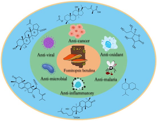Human utilization of F. betulina can be traced back to thousands of years ago. Notably, in 1991, the discovery of a 5000-year-old ice mummy in Italy, which was found with two specimens of F. betulina, suggests that ancient humans may have recognized and utilized its medicinal properties. Scholars hypothesize that these early people exploited F. betulina for its potential therapeutic effects, possibly using it to treat intestinal parasites or as an antibacterial agent [9]. Although there is some debate regarding the intended uses of the specimens found with the ice mummy, the enduring presence of F. betulina in cultural practices underscores its significance. For instance, Russian folklore describes the use of F. betulina fruiting bodies brewed as mushroom tea to alleviate fatigue and enhance immune function [10]. Additionally, in regions such as Siberia, the Baltic states, and Finland, this birch polypore fungus is commonly used to treat various types of cancer [11]. In contemporary times, driven by advances in technology and increased research capabilities, it has been established that F. betulina contains compounds with a spectrum of biological activities, including antibacterial, anti-parasitic, antiviral, anti-inflammatory, anti-cancer, and immunomodulatory effects [12].
