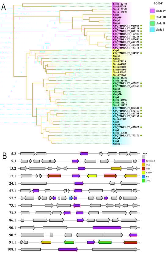 Fungal sesquiterpene synthases are typically classified into four branches. Clade I: Involves the formation of a 10-membered ring carbocation intermediate and a E,E-germacradienyl cation via the 1,10-cyclization of (2E,6E)-FPP. Clade II: Generates an E-germacradienyl cation through the 1,10-cyclization of (3R)-nerolidyl diphosphate. Clade III: Leads to the creation of an 11-membered ring carbocation intermediate, namely, trans-caryophyllene cation, via 1,11-cyclization. Clade IV: Forms a six-membered ring carbocation intermediate, (6R)-β-bisabolol cation, through the 1,6-cyclization of (3R)-NPP [70]. As shown in Figure 9A, through the analysis of the amino acid sequences and evolutionary relationships of 18 terpene synthases in F. betulina, we found that these sesquiterpene synthases are primarily distributed among class I and class IV, with six and nine representatives, respectively. The remaining sequences are distributed in class II and class III, with two and one representatives, respectively. In recent years, heterologous expression has become an important tool for elucidating gene functions and efficiently producing valuable natural products [71]. To facilitate subsequent research on sesquiterpene synthases in F. betulina, we predicted and annotated the sesquiterpene synthase gene clusters in F. betulina, as shown in Figure 9B. The biosynthetic gene clusters 57.1, 57.2, and 73.3 each contain two or more sesquiterpene synthase genes. Apart from the sesquiterpene synthase, cluster 17.1 contains two P450 monooxygenases, one NADP-dependent dehydrogenase, and one FAD monooxygenase. In cluster 91.1, besides the sesquiterpene synthase, there are also two Ubia-type isoprenyl transferases, one P450 monooxygenase, and one FAD monooxygenase. In the future, by using the heterologous expression of these genes or gene clusters, we can uncover the mechanisms of their synergistic effects and pave the way for synthesizing complex sesquiterpenes that are rare or previously unobserved in nature.