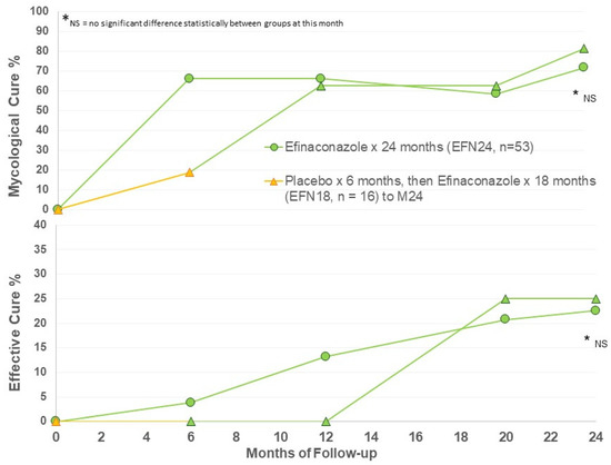 A moderately high rate of mycological cure was found after 6 months of active efinaconazole use, and ongoing to Month 24 (Figure 1). After 12 months of efinaconazole 10% solution, the MC was 60%, similar to the phase III trial efficacy (53–55%) [11,12]. The MC of vehicle for 6 months (EFN18 at Month 6) was 20%, similar to the vehicle MC of the phase III trials at week 52 (17%) [11,12]. MC in the EFN18 group was able to achieve comparable MC to EFN24 after 6 months of active efinaconazole use to M12, and ongoing to M24 follow-up. There appears to be some increase in MC in both groups at M24 compared to M12.