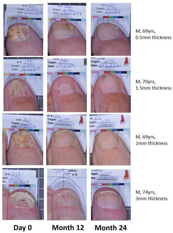 Effective cure increases from M12 to M24 in both groups, indicating continued improvement in target nails beyond the 12-month period with continued efinaconazole 10% once daily use (Figure 1). The EFN18 group was able to achieve similar outcome measures to the EFN24 group at M24. Figure 2 shows successful clinical outcomes of a selection of patients using efinaconazole for 24 months.
