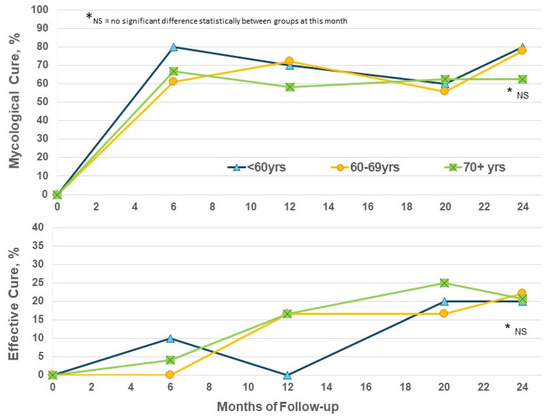 The enrolled population in this trial is significantly older than that in the phase III trials which restricted age to 70 years or less [11,12]. Considering efficacy by patient age in the EFN24 group only, the EC rates show some increase from M12 to M24 for the ≥70-year subgroup, as well as the younger subset, and reached similar levels at M24 regardless of age (Figure 3). Increased age does not appear to be a negative factor for obtaining improvements with efinaconazole.