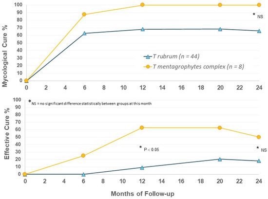 The causative organism in toenail onychomycosis in North America is generally Trichophyton rubrum and to a lesser extent T. mentagrophytes complex. Our study population reflected this general demographic finding. The effective cure was significantly higher in the T. mentagrophytes complex patients versus T. rubrum at Month 24 (patients using efinaconazole for 24 months only). Of the 14 patients enrolled with primary T. mentagrophytes complex infection, 5 patients (5/14, 35.7%) reported some degree of efinaconazole reaction. There are many other patient factors that may be relevant to these findings and these were not investigated here, but our data suggest a more active response by the patients on several fronts when T. mentagrophytes complex is the causative organism group, and more investigation into species-specific outcomes is warranted for efinaconazole.